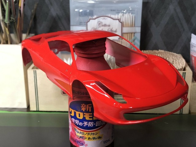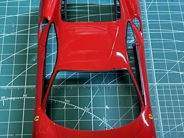 フジミ1/24 フェラーリF430 今夜の作業成果(再) まず、、、 昨夜の一番苦手な窓枠塗装は大失敗? ペイントマーカーが滲んでハミ出し&曲線用マステがクリア層に侵食ノリ痕 結果 磨き直しましたとさ? う〜ん、、、 素直に艶消し黒のフィニッシュシート貼りましょう 今夜はココまで?