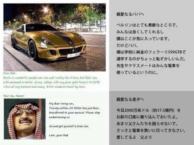 【石油王とその息子の会話】 (息子) 親愛なるパパへ ベルリンはとても来敵なところで、 みんなは良くしてくれるし僕はここが気に入っています。だけどハバ、 優は学校に純金のフェラーリ599GTBで通学するのがちょっと恥ずかしいんだ。 先生やクラスメートはみんな 電車を使っているというのに。 フェラーリ 2023.12.29 ハク|SNSアフィで飯食ってます @Haku_affi?utm_source=yjrealtime&utm_medium=search